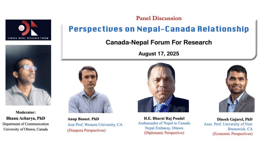 The Canada-Nepal Forum for Research is hosting a timely panel discussion on “Perspectives on Canada–Nepal Relationship” on August 17, 2025. Against the backdrop of heightened U.S. tariffs under President Trump’s second term—impacting Canada’s economy despite a free trade agreement—Canada is seeking to diversify its trade and diplomatic ties beyond its traditional U.S. reliance. This shift presents a unique opportunity for Nepal to position itself as a strategic partner. Bringing together experts from diplomacy, economics, and the Nepali diaspora, the discussion will explore how Canada–Nepal relations can be strengthened in this evolving geopolitical climate. Our distinguished panelists will address critical questions about bilateral trade potential, investment, cultural exchange, and the role of the diaspora in deepening ties. This event will examine how both nations can transform current global challenges into opportunities for mutual growth.